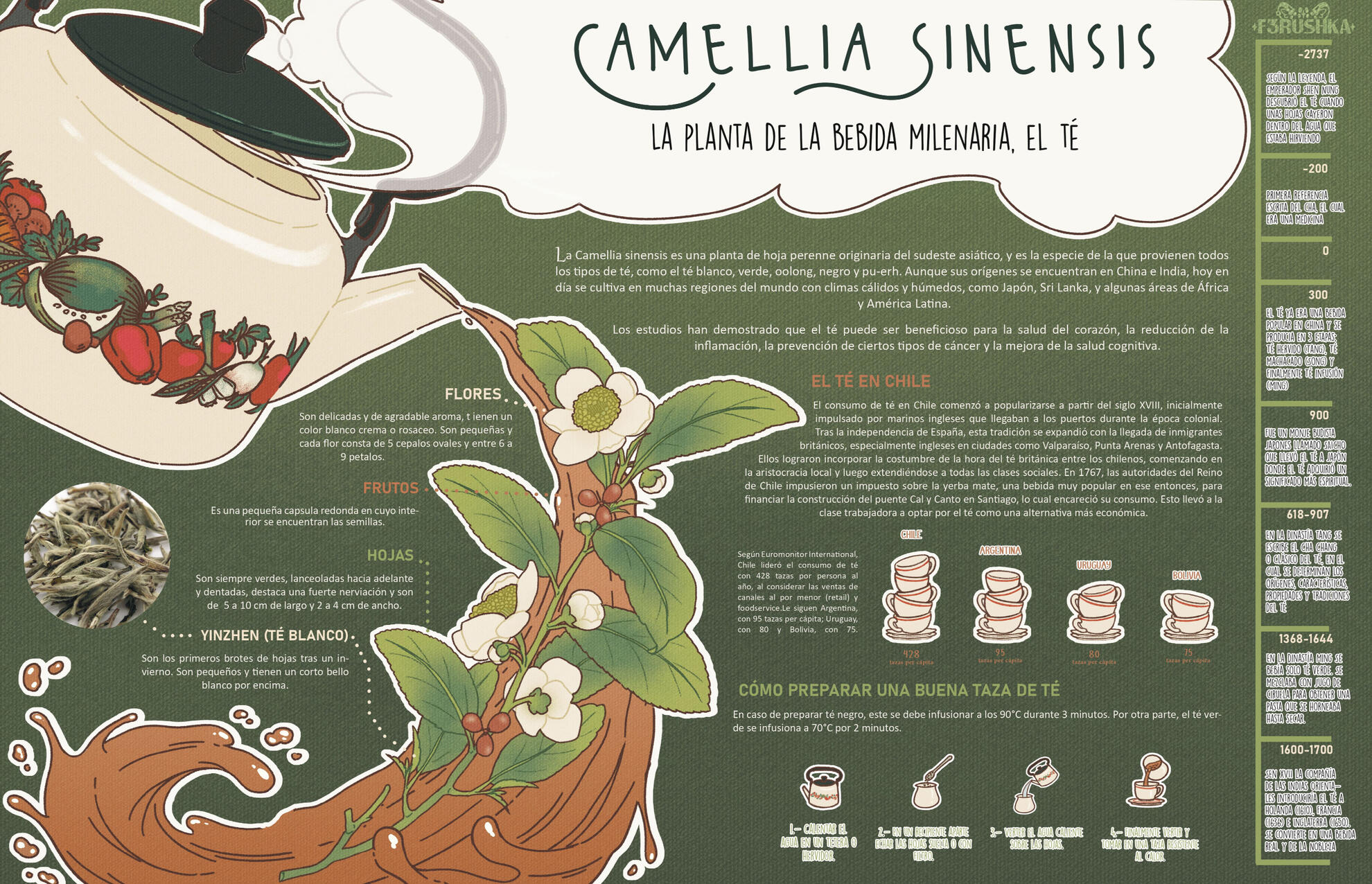 Infografía del té relacionada con su historia, propiedades e influencia en Chile.